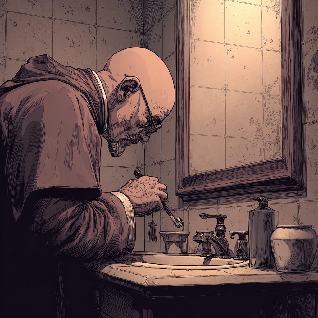 A flutter on my forehead interrupts my evening ablutions as I remove my tab collar and set it on the counter. I lean into the mirror and stare at the lone hair, a graying sentinel defending the forgotten frontline of a hair battle I lost long ago.